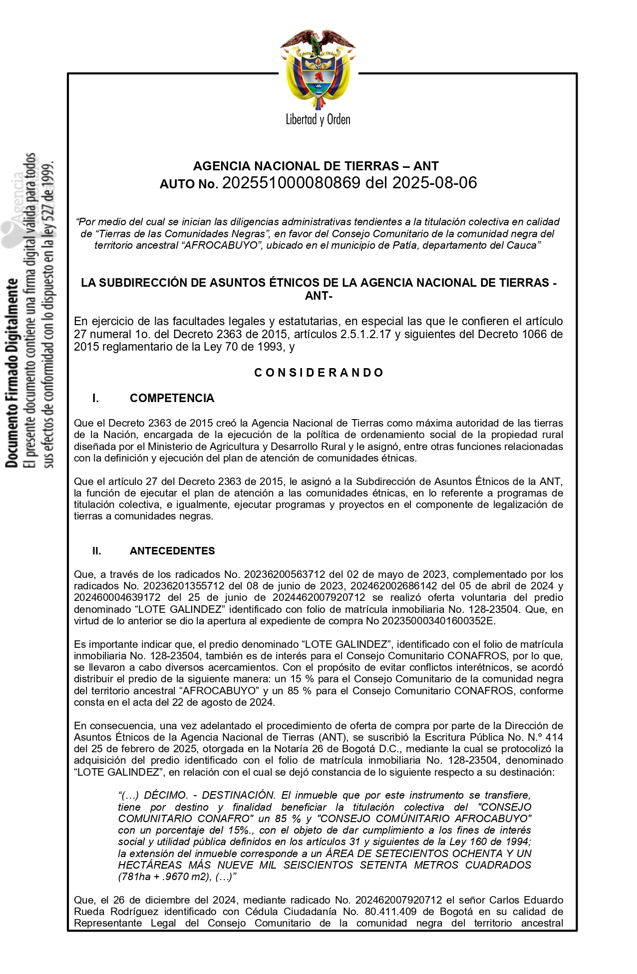 “Por medio del cual se inician las diligencias administrativas tendientes a la titulación colectiva en calidad de Tierras de las Comunidades Negras, en favor del Consejo Comunitario de la comunidad negra del territorio ancestral AFROCABUYO, ubicado en el municipio de Patía, departamento del Cauca”