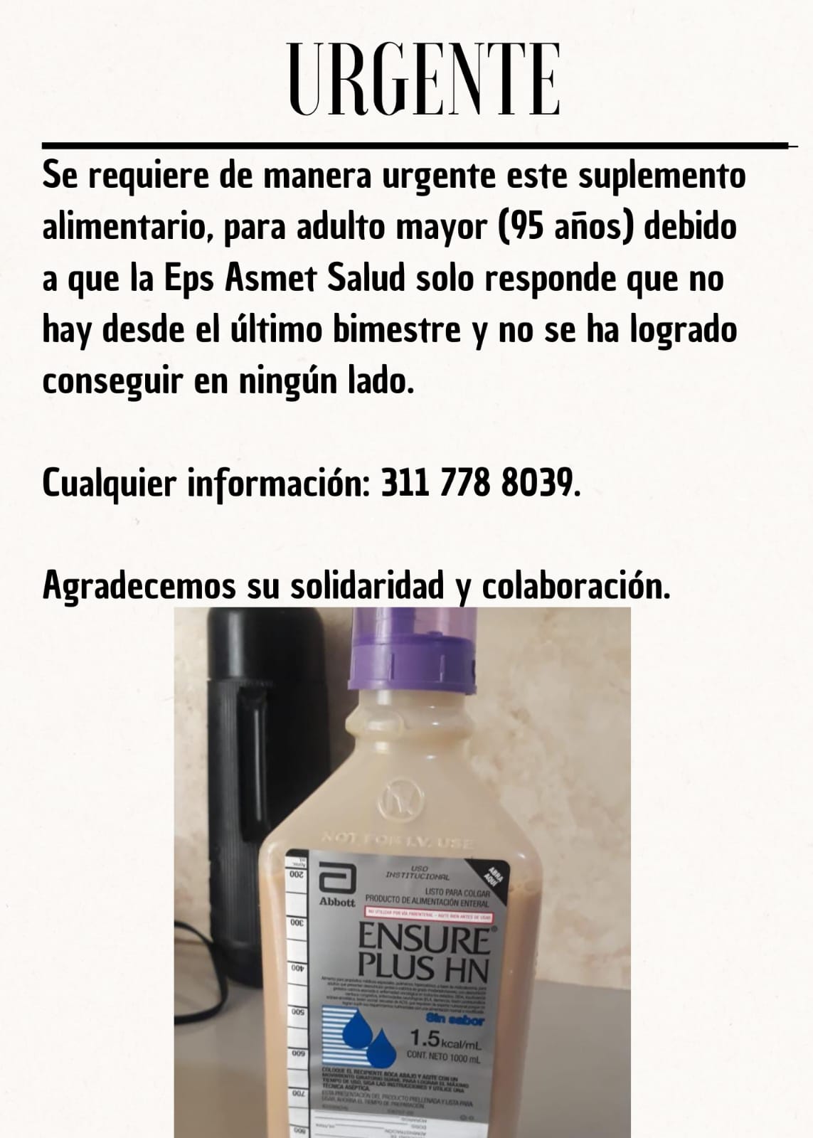 “En la denuncia dicen que se requiere con urgencia este suplemento alimentario para un adulto mayor de 95 años, debido a que Asmet salud solo responde que no hay desde el último bimestre y no se ha logrado conseguir en ningún lado”.