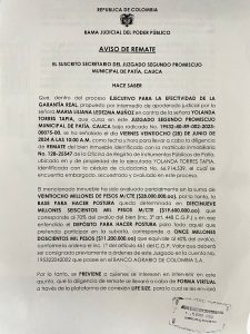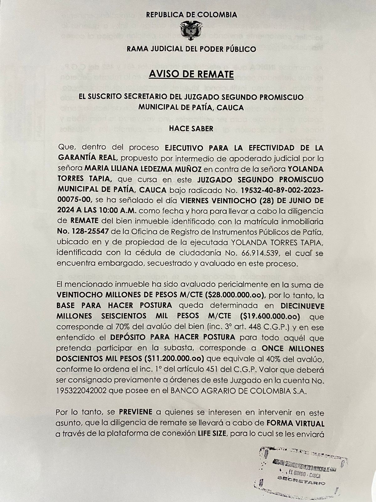 Que, dentro del proceso EJECUTIVO PARA LA EFECTIVIDAD DE LA GARANTÍA REAL, propuesto por intermedio de apoderado judicial por la señora MARIA LILIANA LEDEZMA MUÑOZ en contra de la señora YOLANDA TORRES TAPIA, que cursa en este JUZGADO SEGUNDO PROMISCUO MUNICIPAL DE PATÍA, CAUCA bajo radicado No. 19532-40-89-002-2023-00075-00, se ha señalado el día VIERNES VEINTIOCHO (28) DE JUNIO DE 2024 A LAS 10:00 A.M. como fecha y hora para llevar a cabo la diligencia de REMATE del bien inmueble identificado con la matrícula inmobiliaria No. 128-25547 de la Oficina de Registro de Instrumentos Públicos de Patía, ubicado en y de propiedad de la ejecutada YOLANDA TORRES TAPIA, identificada con la cédula de ciudadanía No. 66.914.539, el cual se encuentra embargado, secuestrado y avaluado en este proceso.