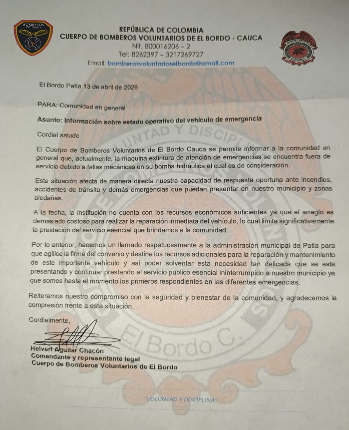 El comunicado está firmado por Helvern Aguilar Chacón, comandante y representante legal del Cuerpo de Bomberos Voluntarios de El Bordo.