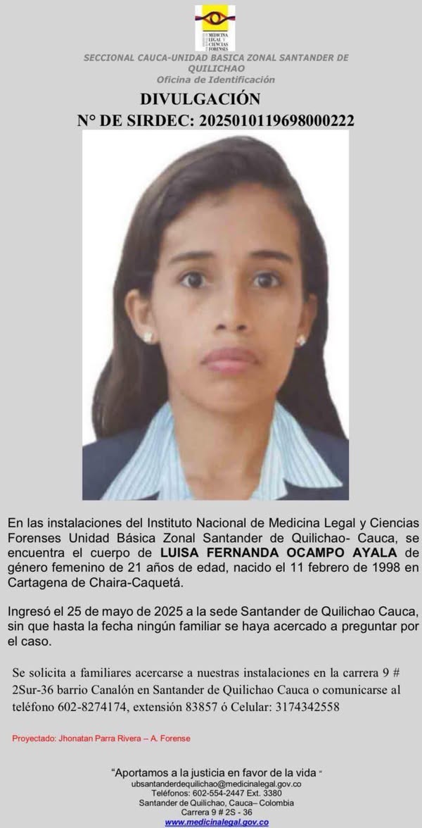 Autoridades del norte del Cauca hacen un llamado urgente a la ciudadanía para ubicar a los familiares de Luisa Fernanda Ocampo Ayala, una joven de 21 años, oriunda del municipio de Cartagena del Chairá, Caquetá, quien fue asesinada el pasado fin de semana en el municipio de Santander de Quilichao.