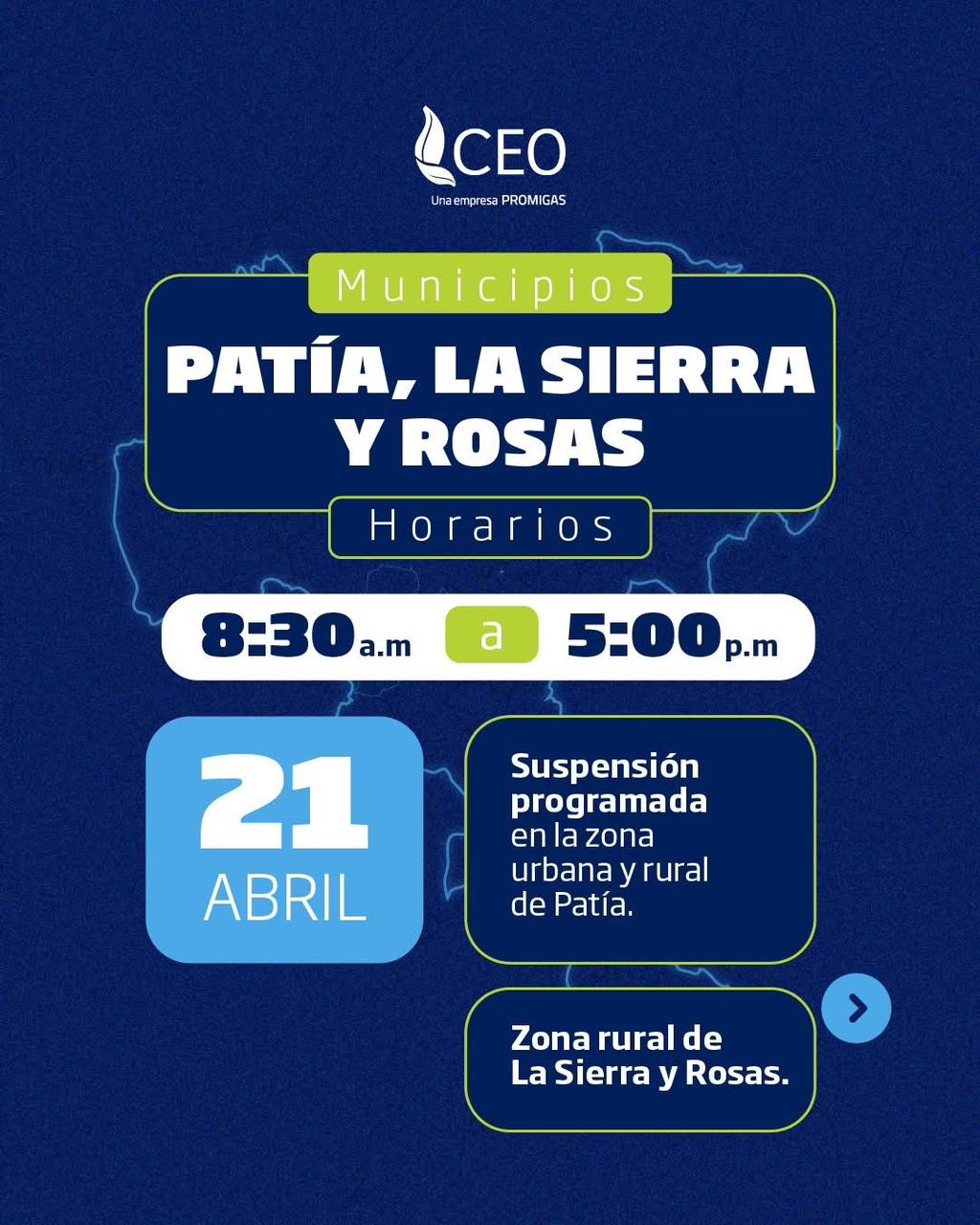 De acuerdo con la información suministrada, la jornada de suspensión está prevista para el municipio de Patía, tanto en su zona urbana como rural, así como en la zona rural de los municipios de La Sierra y Rosas.