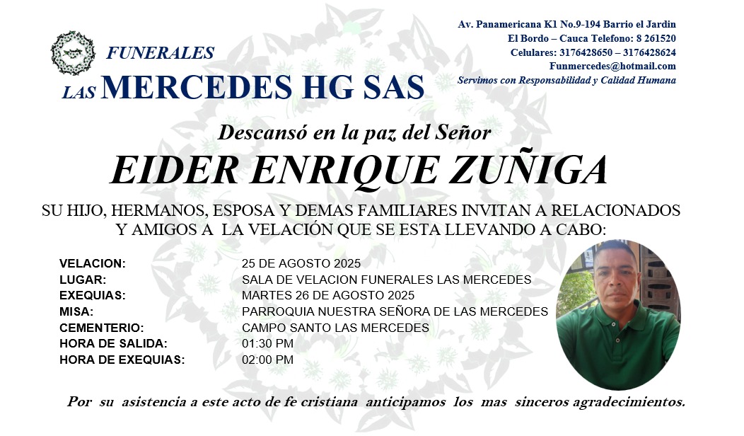 Con profundo pesar, familiares, amigos y allegados lamentan el fallecimiento de Eider Enrique Zúñiga, quien descansó en la paz del Señor.