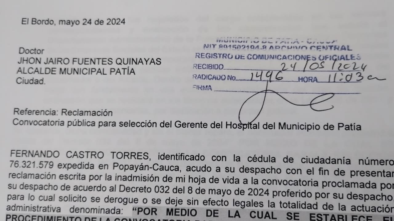 En un reciente desarrollo, el Dr. Fernando Castro Torrez, exgerente del Hospital de El Bordo, ha presentado una reclamación formal en la convocatoria pública para la selección del gerente del centro de salud de los Patianos. La reclamación fue dirigida al despacho del mandatario local, Jhon Jairo Fuentes.