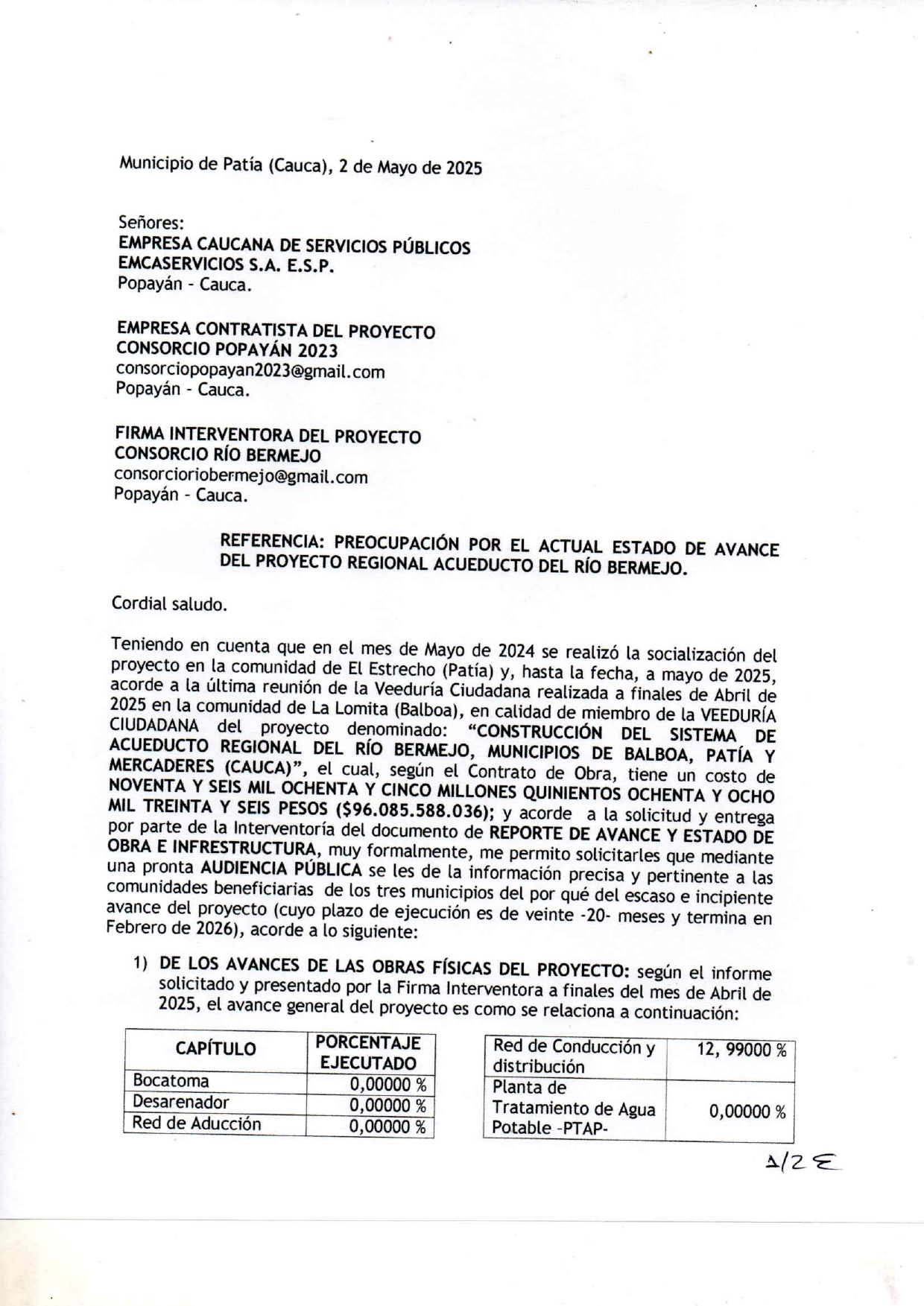 A pesar de que el proyecto de construcción del sistema de acueducto regional del RĆo Bermejo, que beneficiarĆ” a los municipios de Balboa, PatĆa y Mercaderes, fue socializado en mayo de 2024, su ejecución presenta un preocupante retraso.