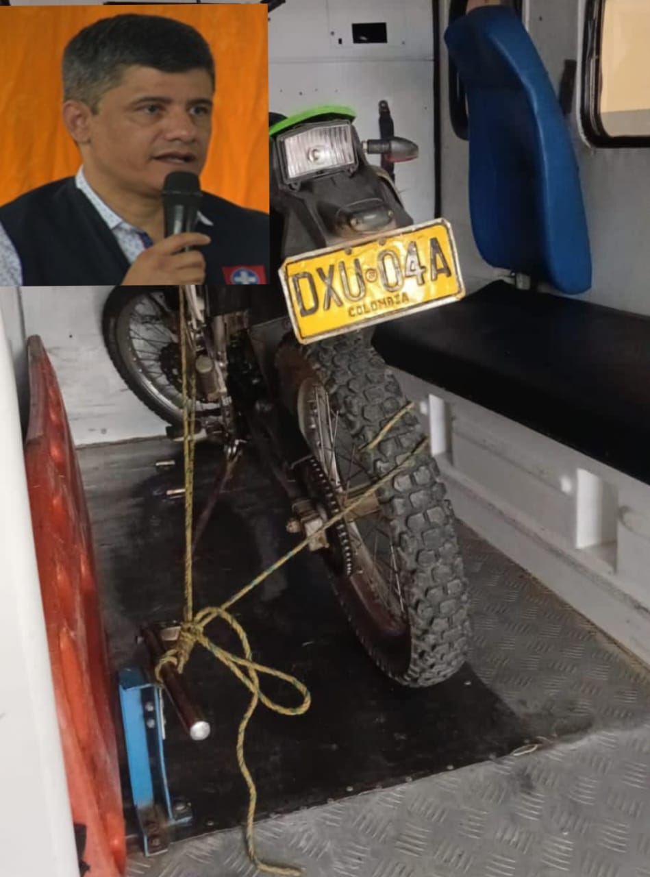 En la imagen se observa como una motocicleta de color verde de placas DXU-04A se ve montada en la parte trasera de lo que seria una ambulancia, incluso esta amarrada y se observa una camilla, la motocicleta esta sobre la carrocería en donde son trasladados los pacientes remitidos a otros centros de salud de la capital caucana.