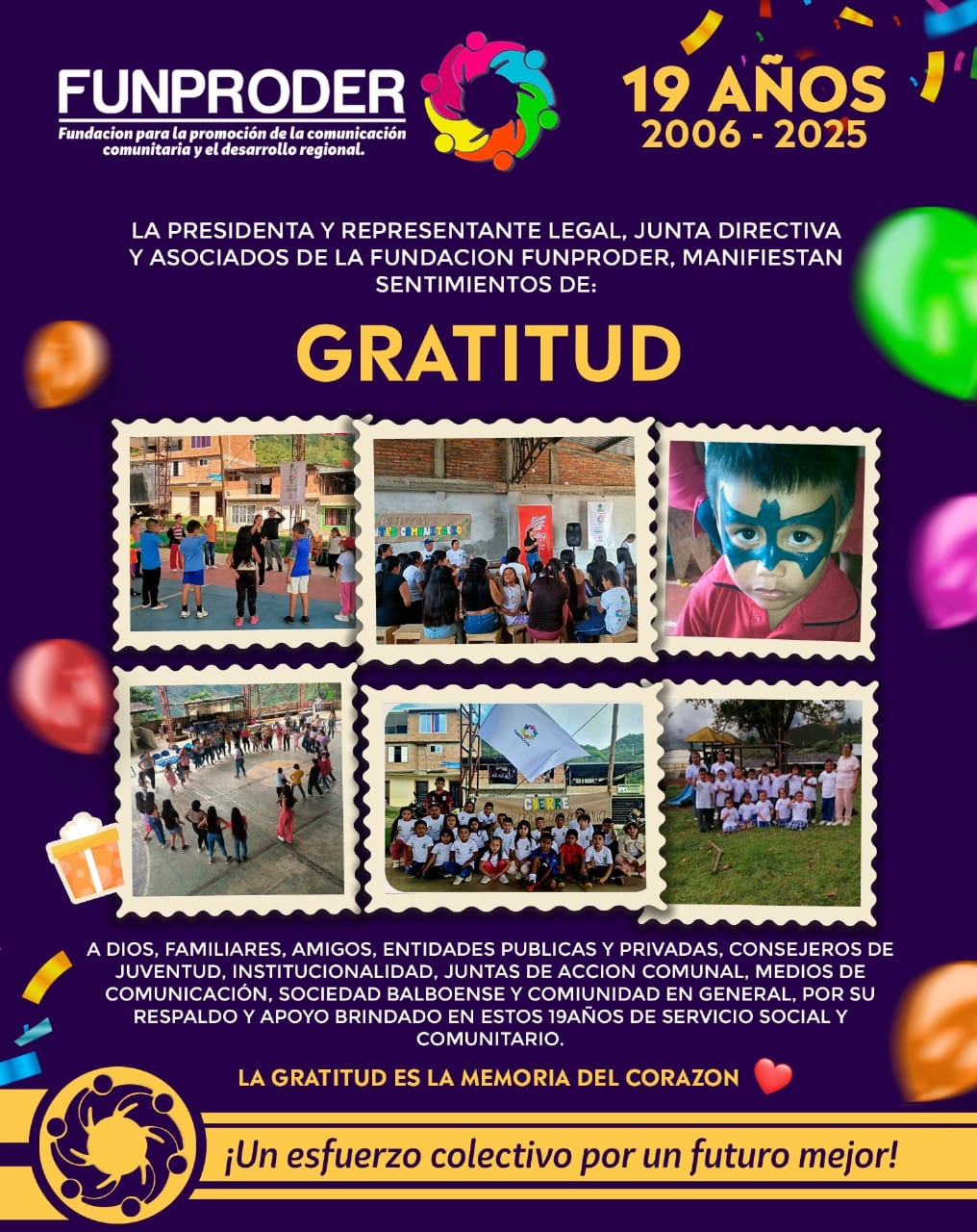 Con la mirada puesta en el futuro, Funproder reafirma su lema āUn esfuerzo colectivo por un futuro mejorā, comprometiĆ©ndose a seguir promoviendo el deporte, la cultura, la comunicación social, el medio ambiente y el liderazgo juvenil, siempre en beneficio de la comunidad balboyana y del sur del Cauca.