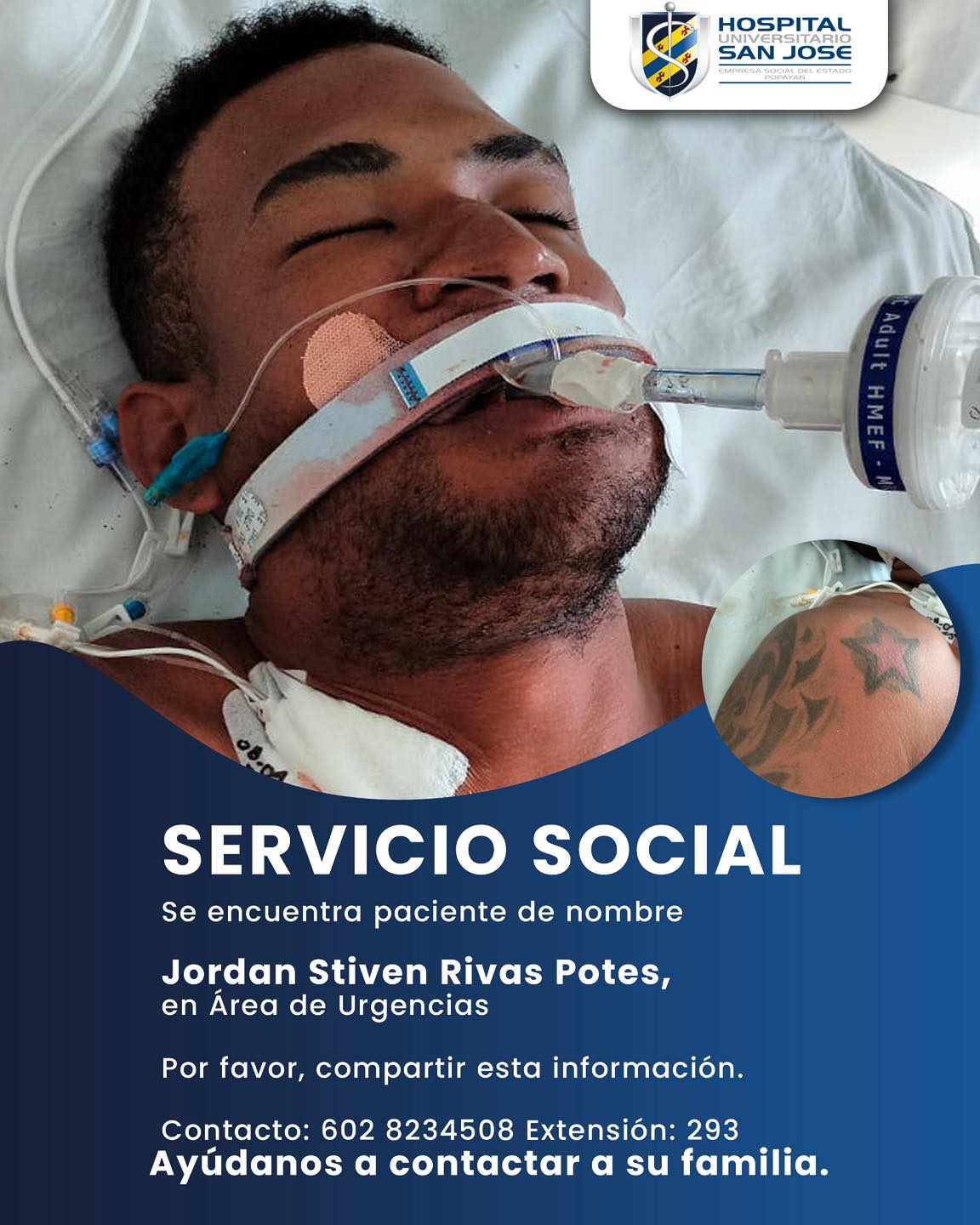 El Hospital Universitario San José de Popayán E.S.E hace un llamado a la comunidad para ayudar a localizar a los familiares de un paciente que actualmente permanece en el área de urgencias.