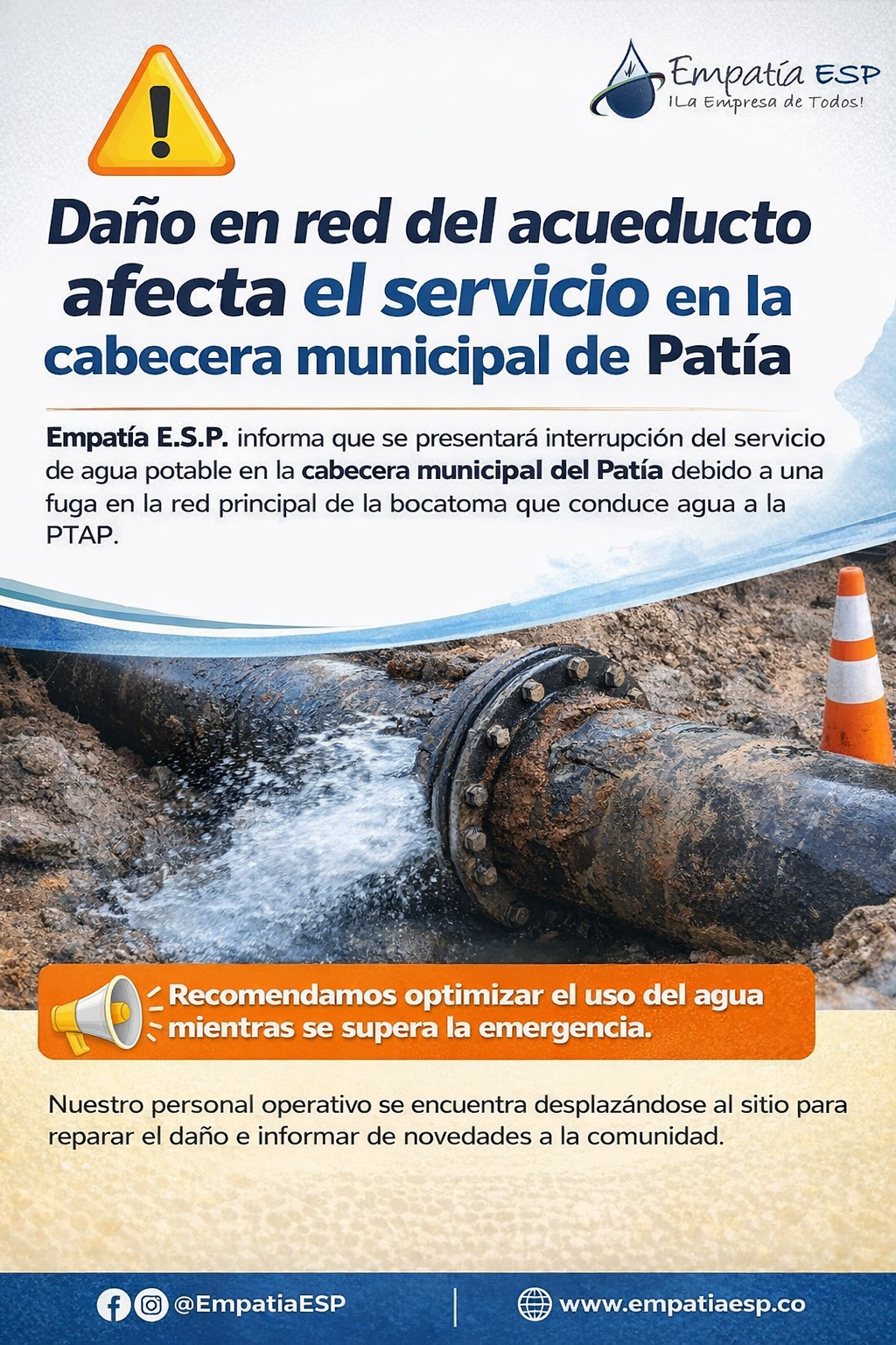 La E.S.E. Hospital Nivel I El Bordo informó a la comunidad que, debido a la suspensión del servicio de agua y la continuidad de esta situación, fue activado el plan de contingencia institucional con el fin de garantizar la atención prioritaria y optimizar el uso del recurso.