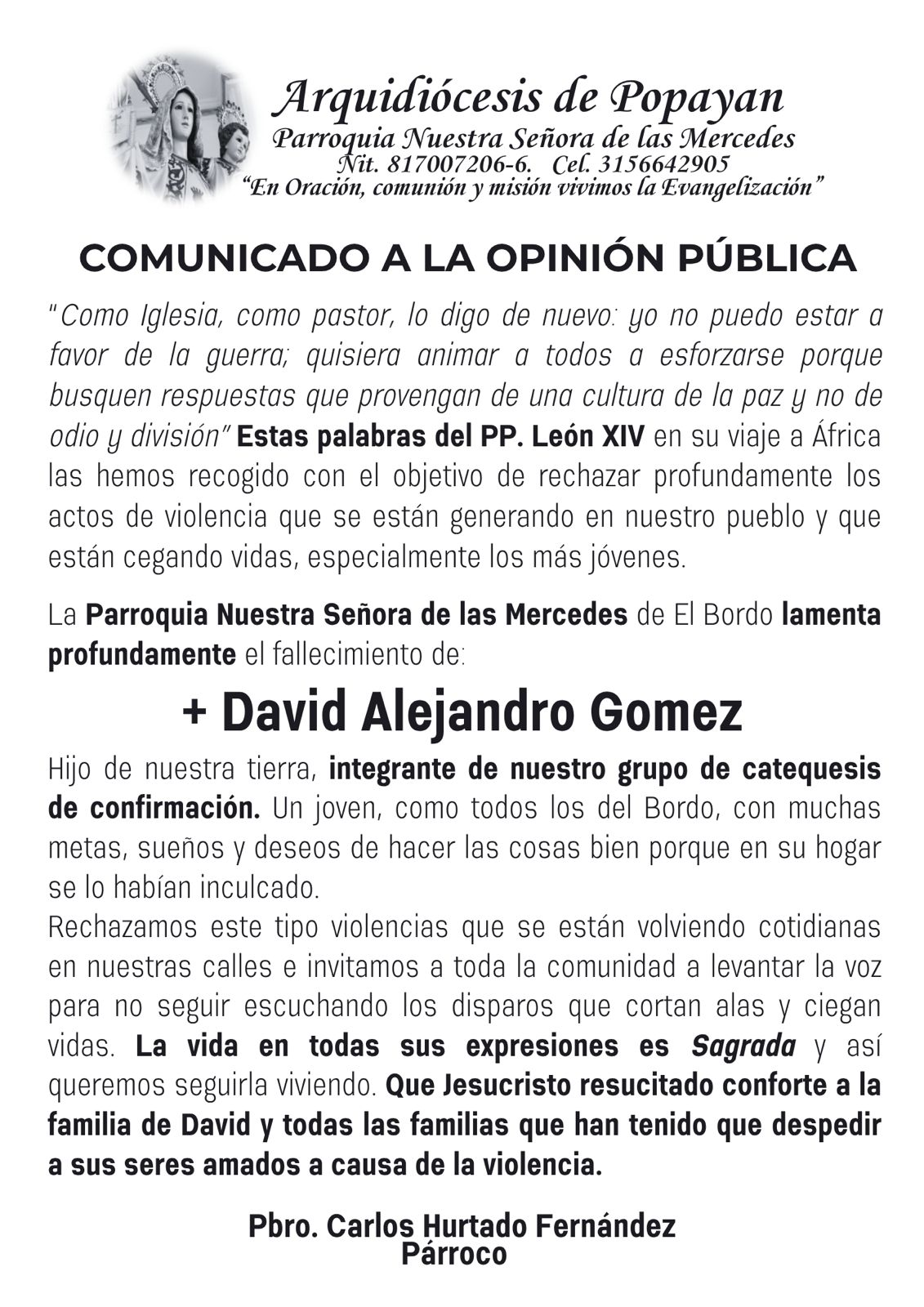 A través de un comunicado a la opinión pública, la Parroquia Nuestra Señora de las Mercedes, perteneciente a la Arquidiócesis de Popayán, lamentó profundamente el fallecimiento de David Alejandro Gómez, joven integrante del grupo de catequesis de confirmación.