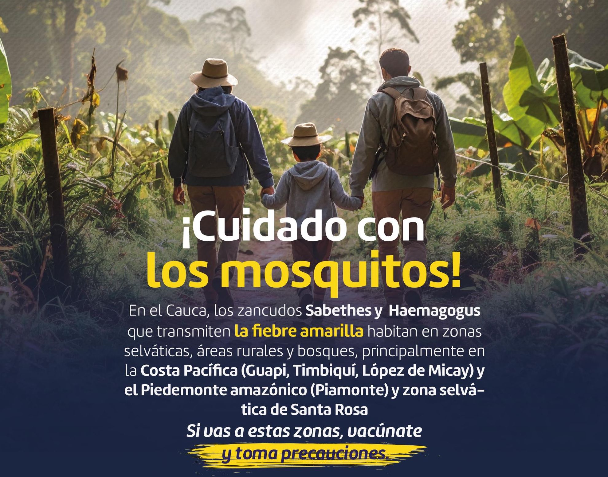 āEn el Cauca, los zancudos Sabethes y Haemagogus que transmiten la fiebre amarilla habitan en zonas selvĆ”ticas, Ć”reas rurales y bosques, principalmente en la Costa PacĆfica (Guapi, TimbiquĆ, López de Micay) y el piedemonte amazónico (Piamonte) y zona selvĆ”tica de Santa rosa. Si vas a estas zonas, vacĆŗnate y toma precaucionesā, agregó el mandatario de los caucanos.