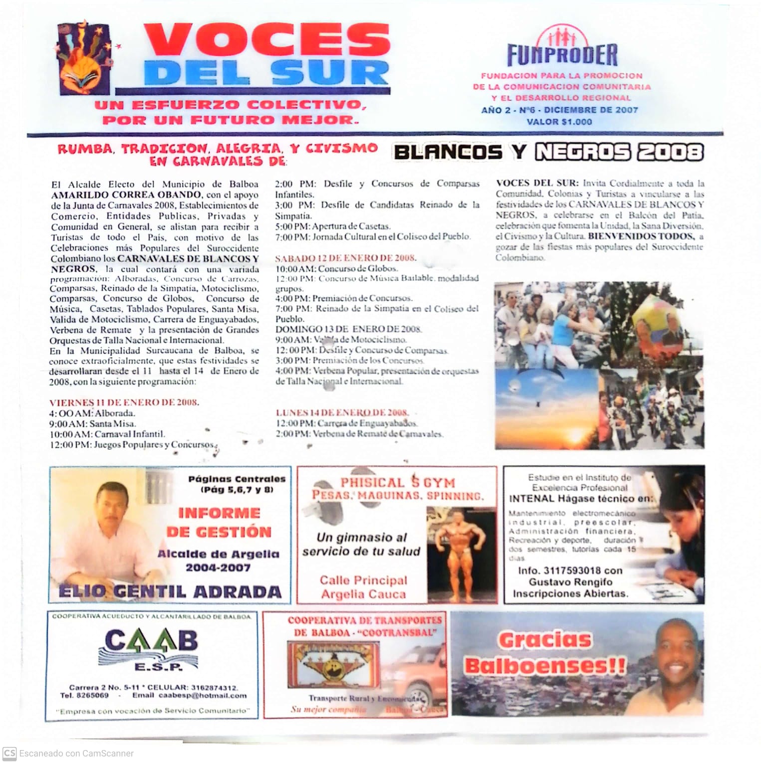 Hecho que fue resaltado en su momento por el Periódico “El Liberal” de la Ciudad de Popayán, que titulo la noticia “Voces del Sur, Nace en Balboa”, en el cual destaca que el objetivo del periódico, entre otros, es “resaltar las fiestas y celebraciones de Argelia y Balboa, y circula cada tres meses”, y en referencia a la cobertura geográfica de la publicación, expreso; “aunque es un medio en formato tabloide con tan solo cuatro hojas de contenido ya circula en dos de los Municipios del Cauca como son Argelia y Balboa”.