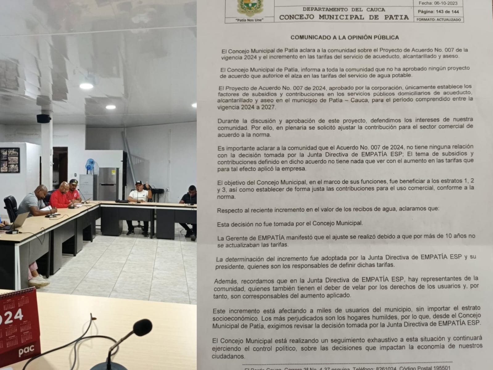 En las últimas horas, el Concejo Municipal de Patía emitió un comunicado a la opinión pública con el fin de aclarar la confusión generada por el incremento en las tarifas del servicio de acueducto, alcantarillado y aseo.