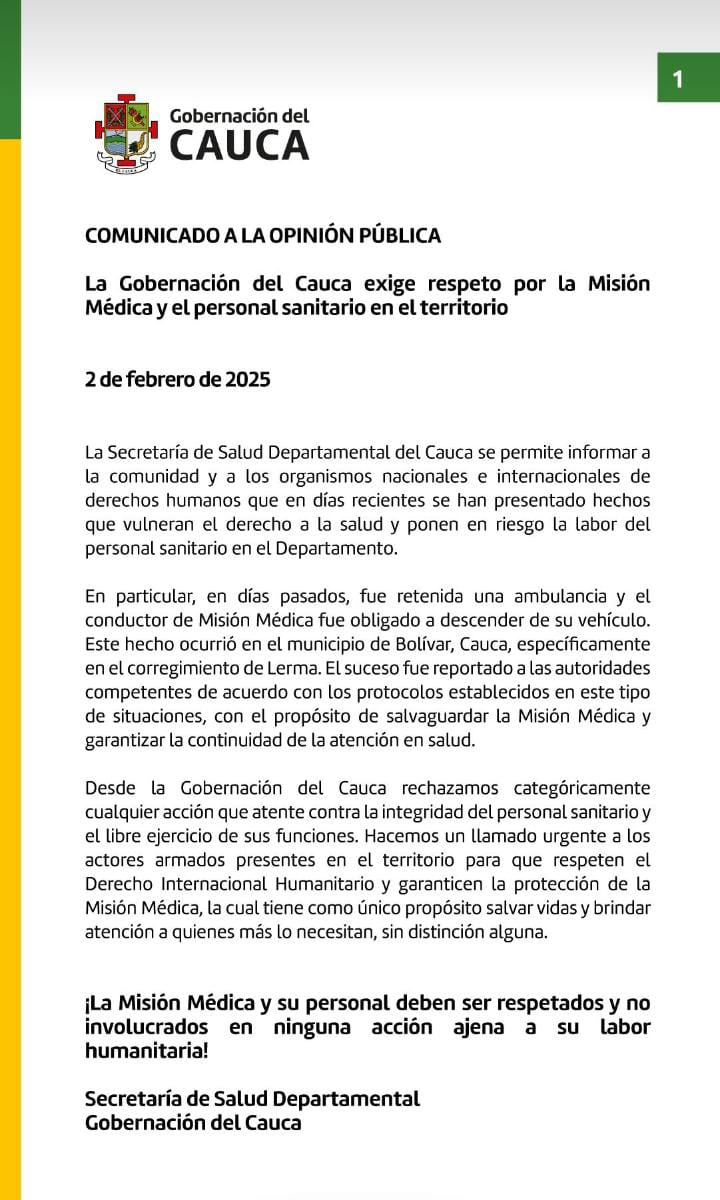La Gobernación del Cauca, a través de la Secretaría de Salud Departamental, ha emitido un enérgico comunicado a la opinión pública, exigiendo respeto por la Misión Médica y el personal sanitario.