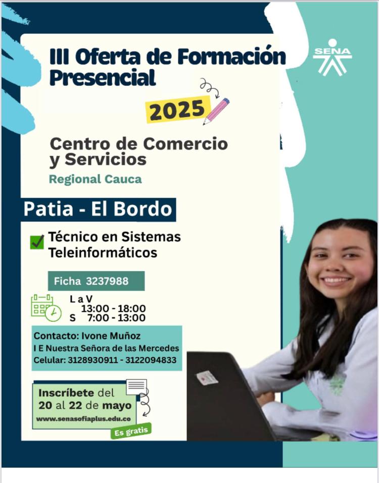 Del 20 al 22 de mayo de 2025, el Servicio Nacional de Aprendizaje – SENA, a través del Centro de Comercio y Servicios – Regional Cauca, abre inscripciones para una nueva cohorte de formación presencial en el municipio de Patía, corregimiento El Bordo.